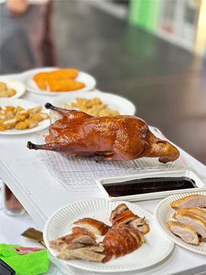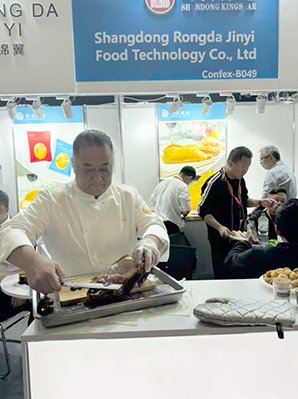 Traditional Beijing Roast Duck: The company is committed to presenting this gem of Chinese culinary art in its most authentic form. Live cooking demonstrations were a major attraction at the booth, where skilled chefs roasted ducks over an open flame, filling the hall with an irresistible aroma and presenting the perfectly crisped, mahogany-colored delicacy.